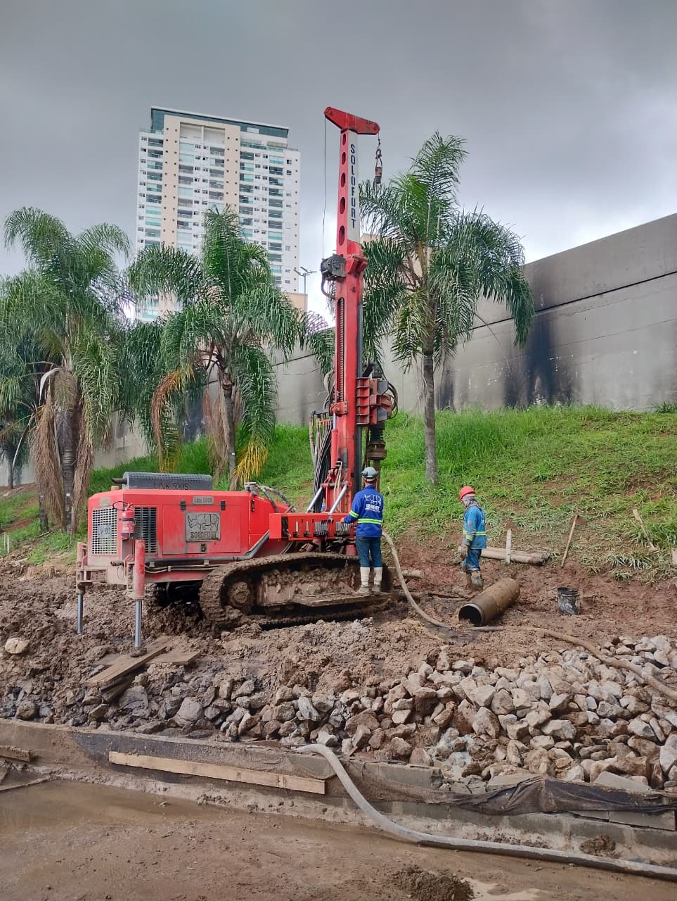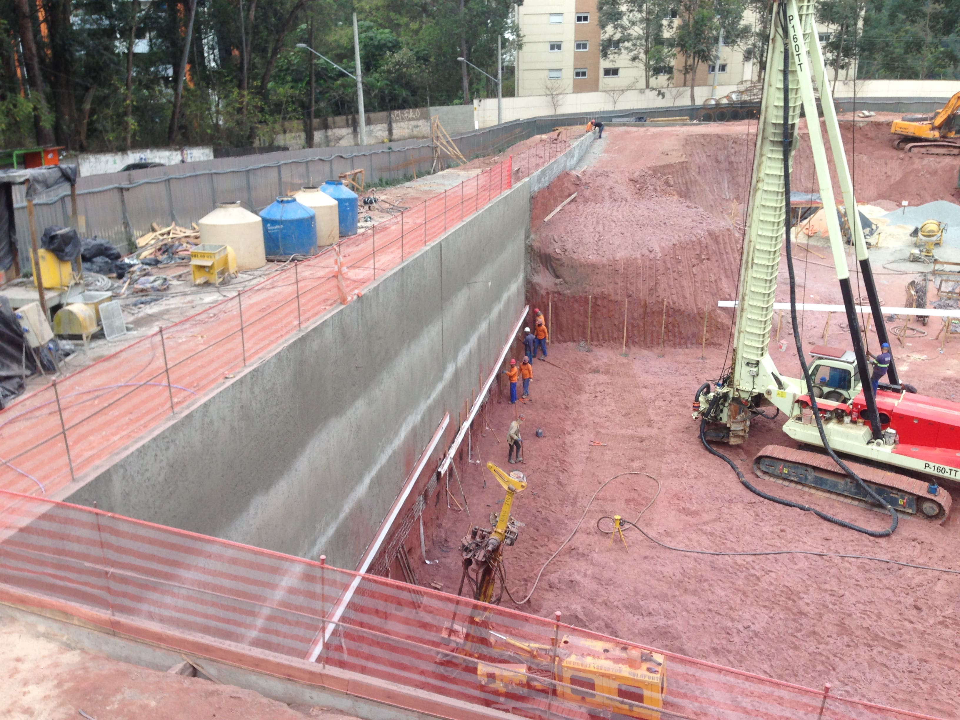 Estacas moldadas in loco executadas com perfuratrizes rotativa (trecho em solo) e/ou roto percussiva (trecho em rocha), sendo revestidas totalmente com tubos metálicos no trecho em solo, assegurando a estabilidade das paredes durante a perfuração.